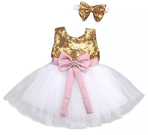 White Dress with Gold Sequins, Dusty Pink Bow, Headband and Crown Brooch