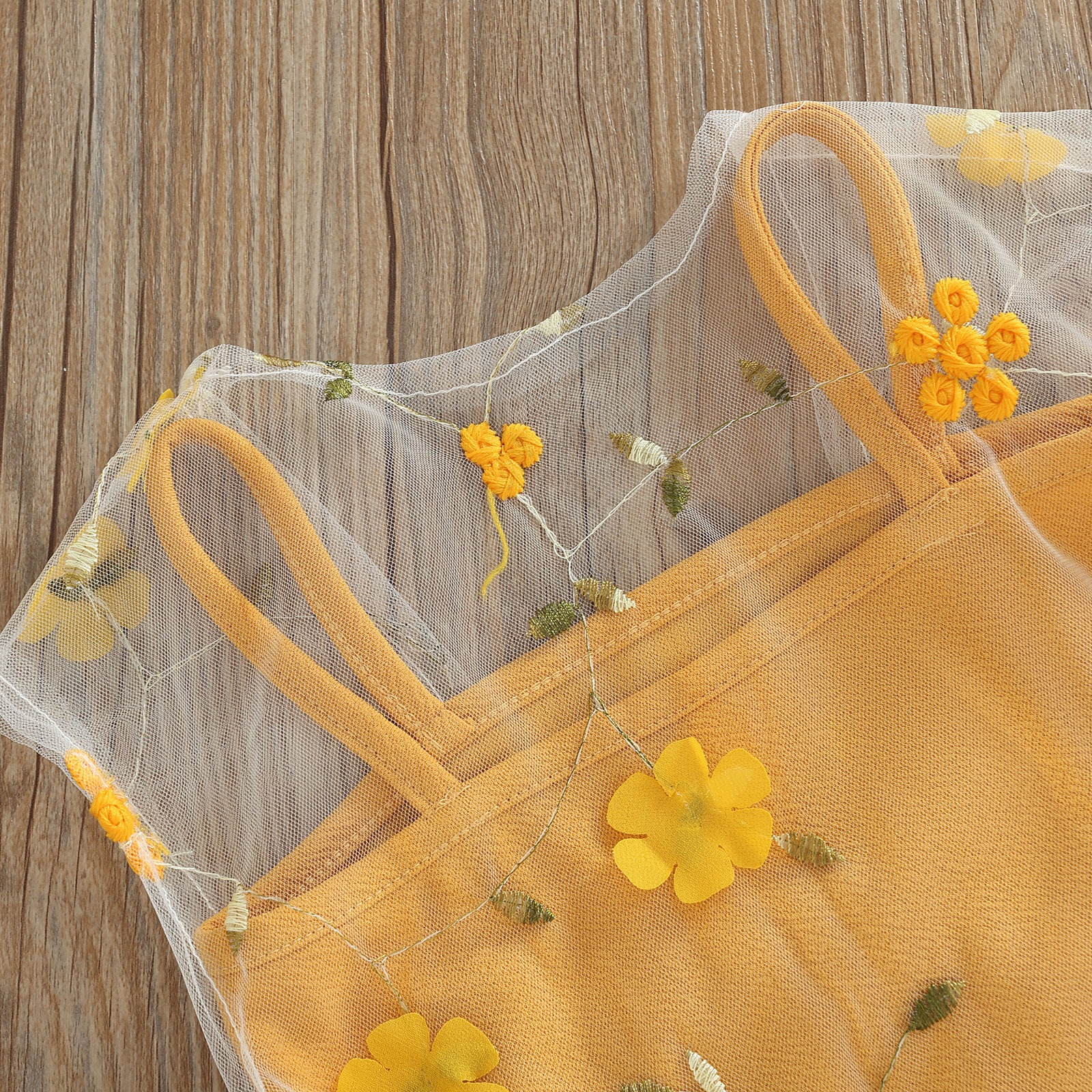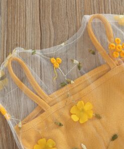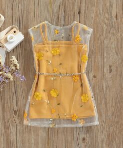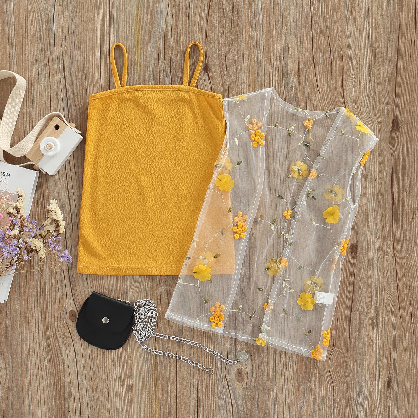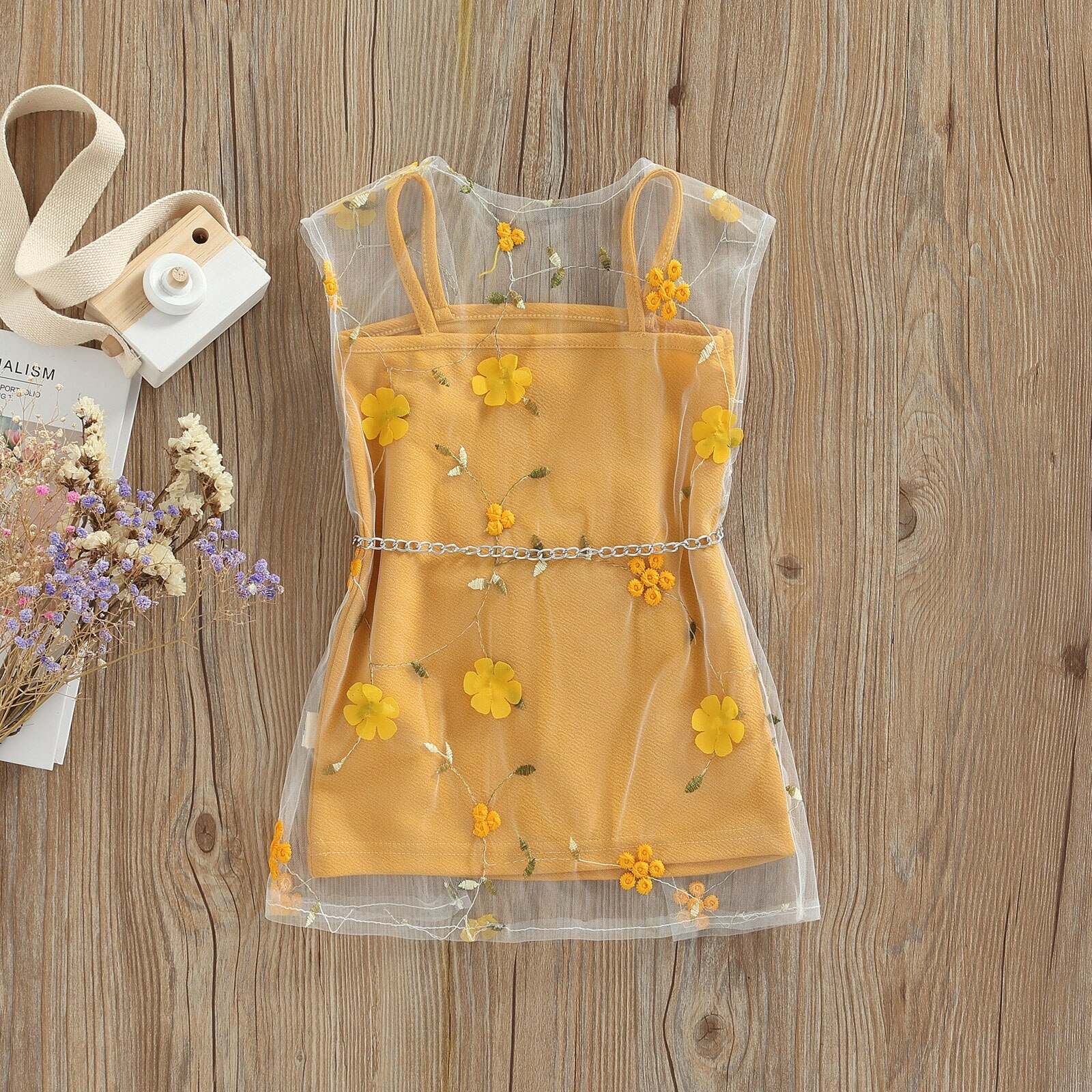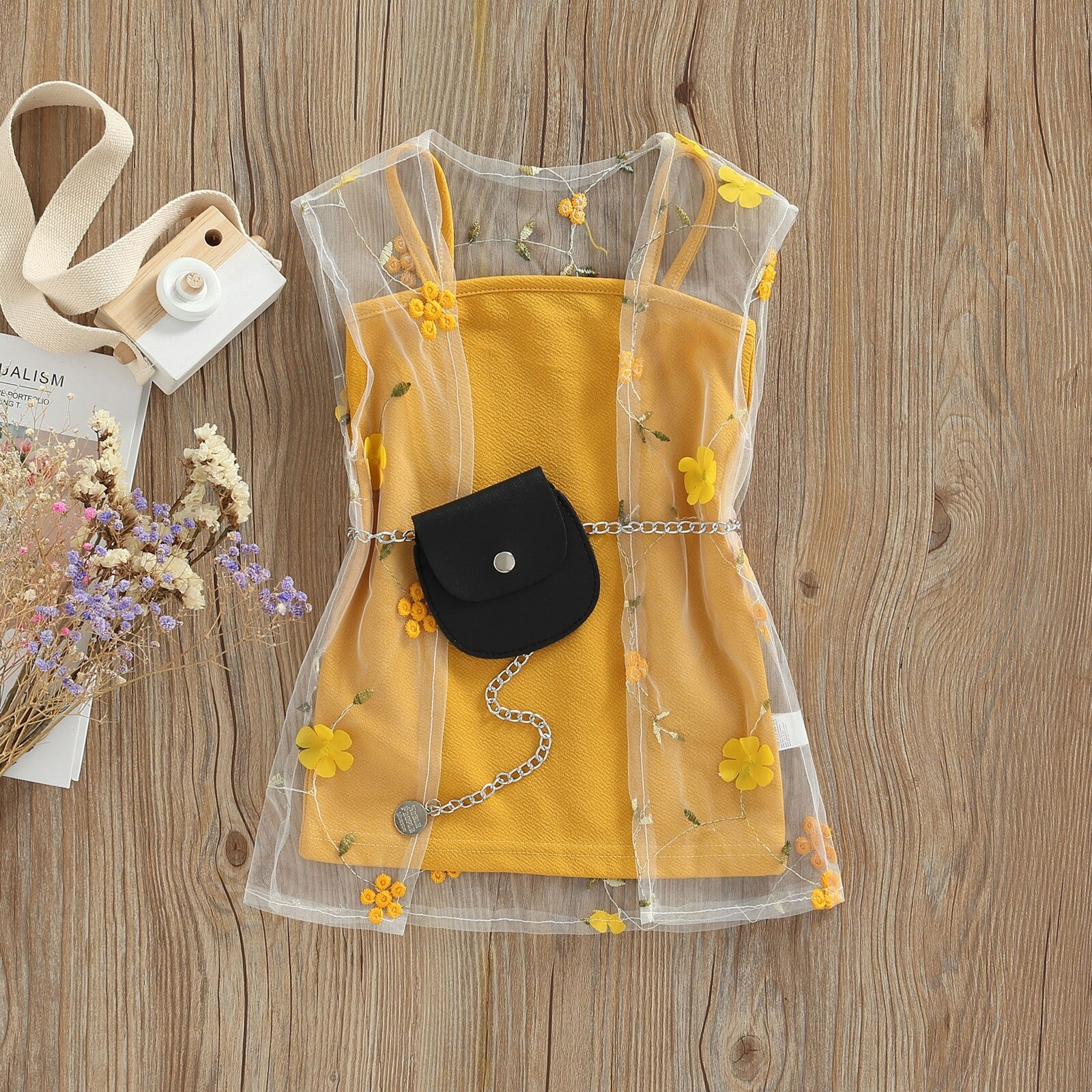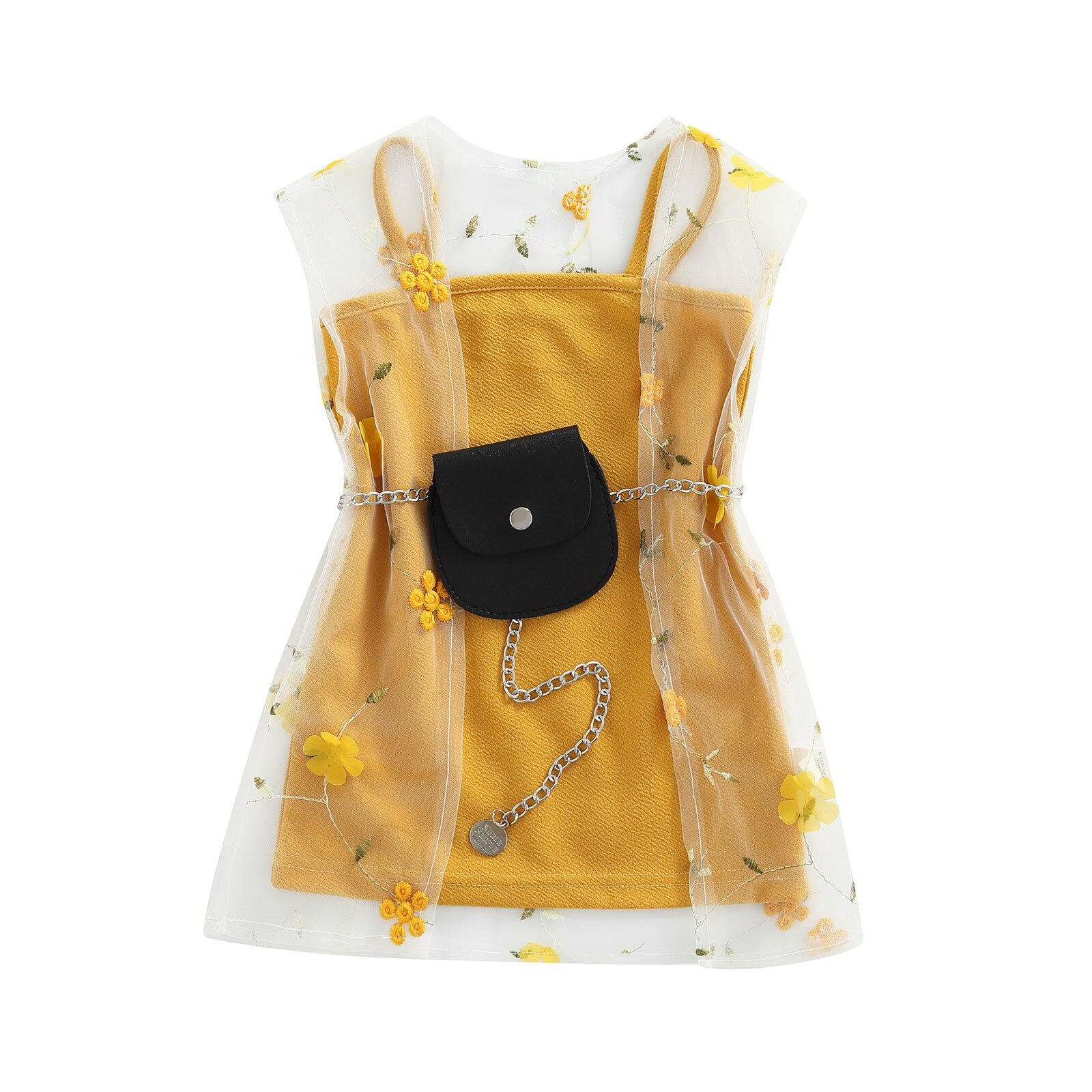 Yellow dress with floral white tulle and mini bag